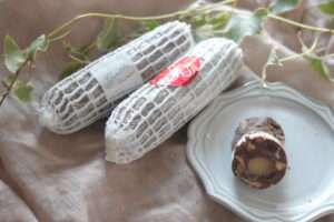 マジパンを練りこんだチョコに、シュトロイゼル、ナッツ、ドライフルーツをふんだんに入れ、さらにマジパンを巻いてシュトーレン風に仕上げました。少しずつカットしてお召し上がりください。